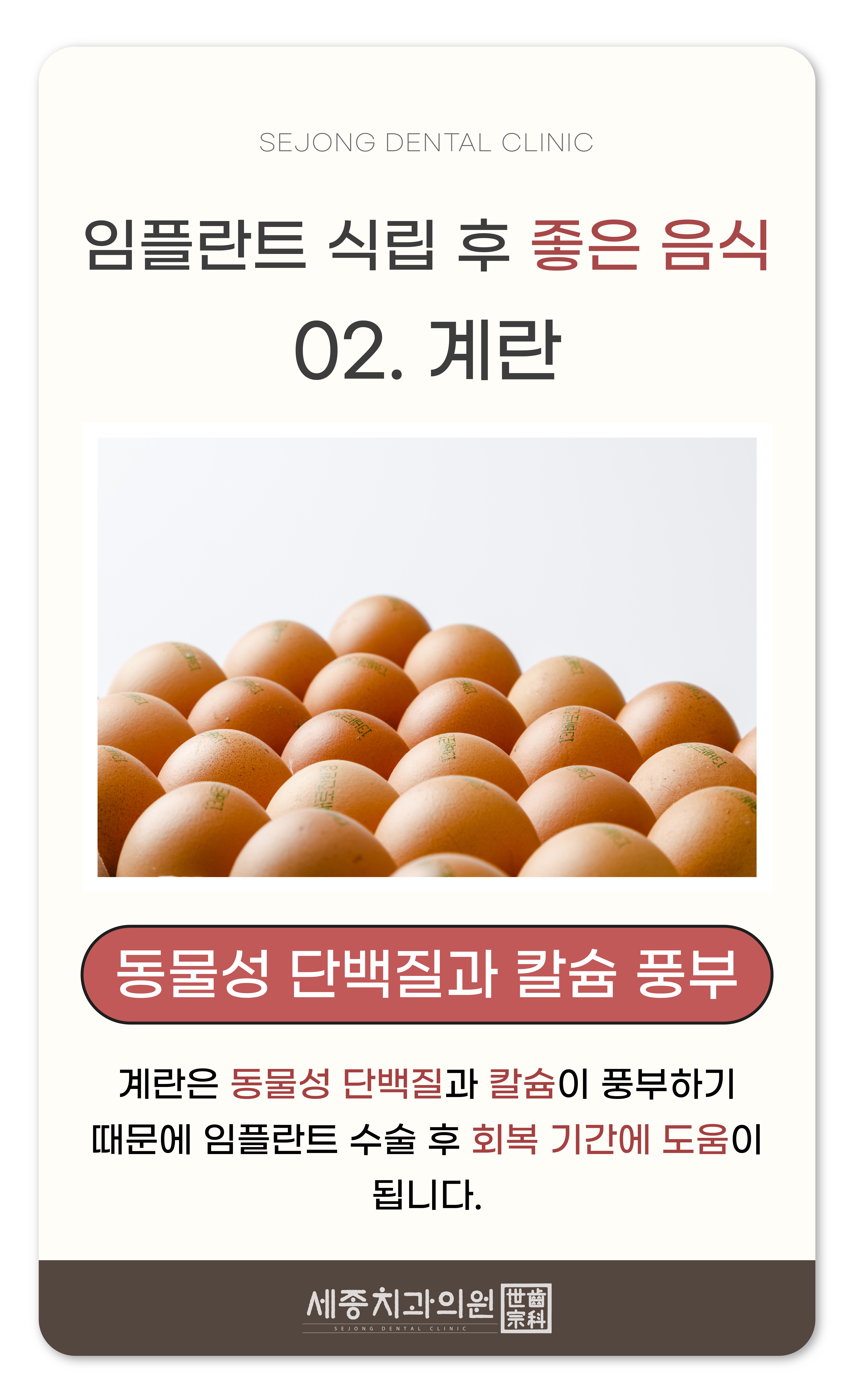계란 역시 두부처럼 잇몸과 치아에 자극을 주지 않고 먹을 수 있습니다. 계란은 동물성 단백질과 칼슘이 풍부하기 때문에 임플란트 수술 후 회복에 도움이 됩니다.