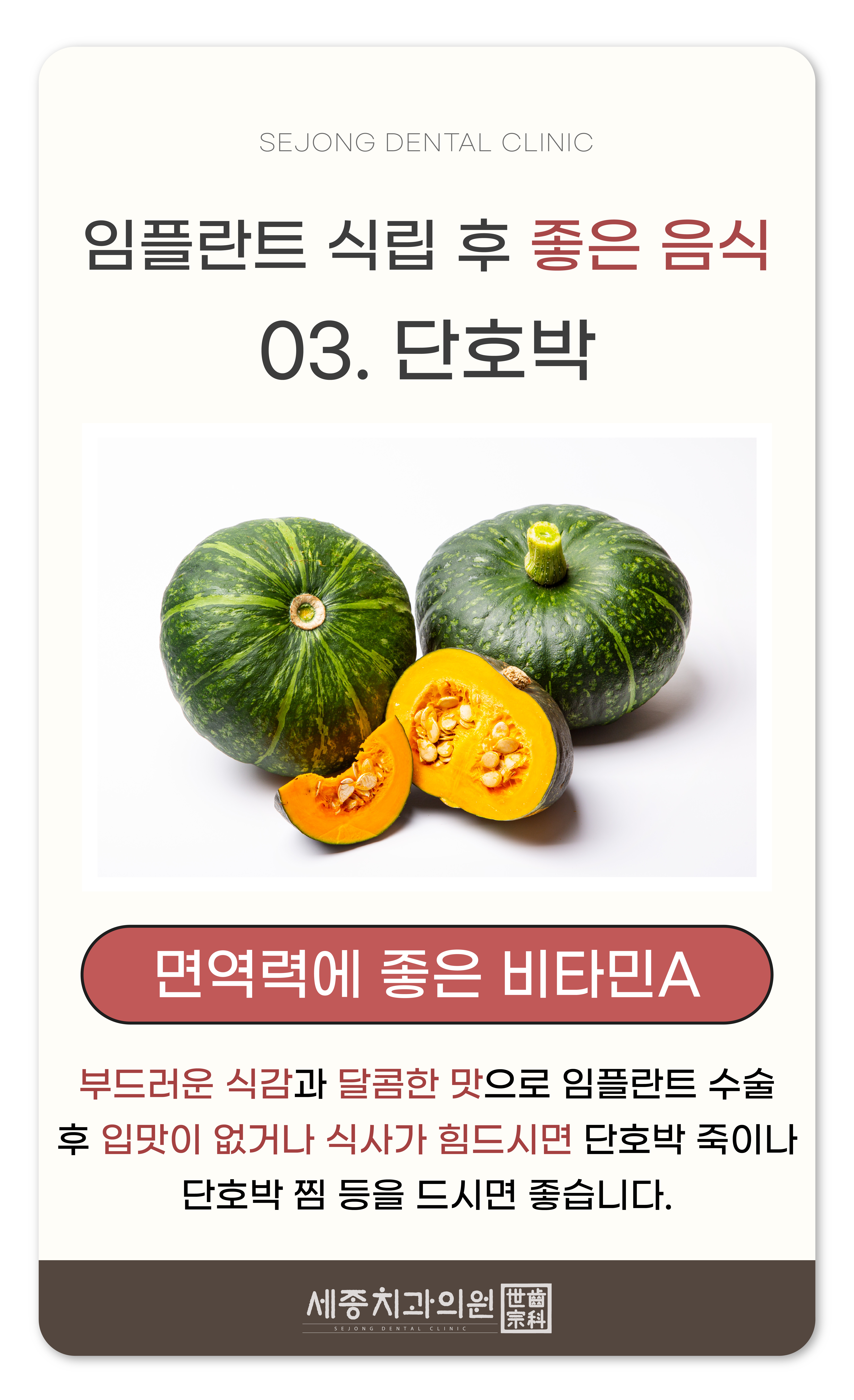 단호박은 면역력에 좋은 비타민A와 다양한 영양소가 풍부한 음식입니다. 단호박의 부드러운 식감과 달콤한 맛으로 임플란트 수술 후 입맛이 없거나 식사가 힘들다면, 단호박 죽이나 단호박 찜 등 단호박을 이용한 음식을 드시면 좋습니다.