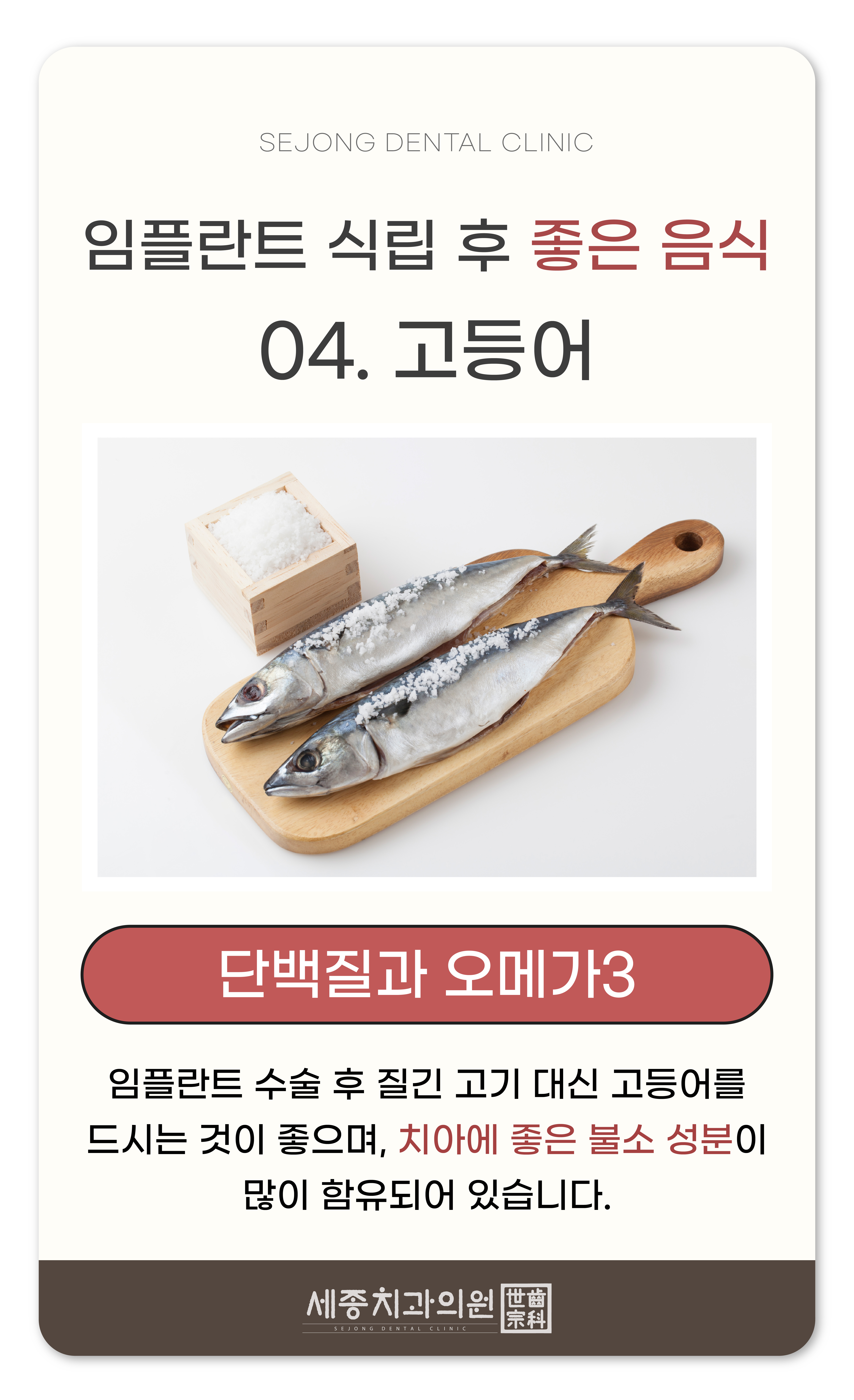 4. 고등어 / 단백질과 오메가3 단백질과 오메가3 등 건강에 좋은 영양소가 풍부한 고등어는 임플란트 수술 후 질긴 고기 대신 단백질을 보충할 수 있으며, 고등어는 치아에 좋은 불소 성분이 많이 함유되어 있다고 합니다.