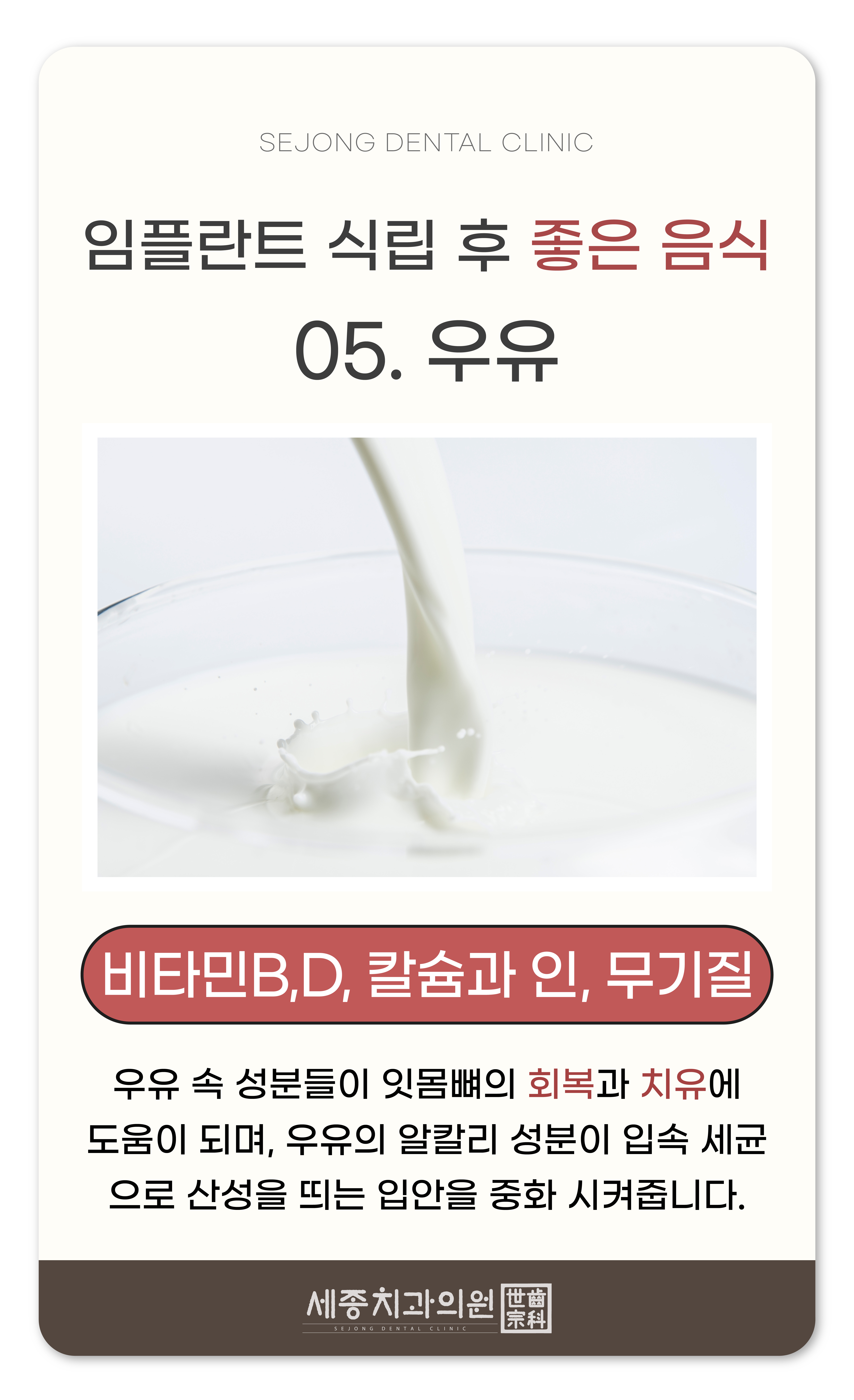 5. 우유 / 비타민B, D, 칼슘과 인, 무기질 우유 속에는 비타민B, 비타민D, 칼슘과 인, 무기질 등이 풍부하며 이 성분들이 잇몸뼈의 회복과 치유에 도움이 됩니다. 입속 세균으로 산성을 띄는 입안을 우유의 알칼리 성분이 중화를 시켜줍니다.