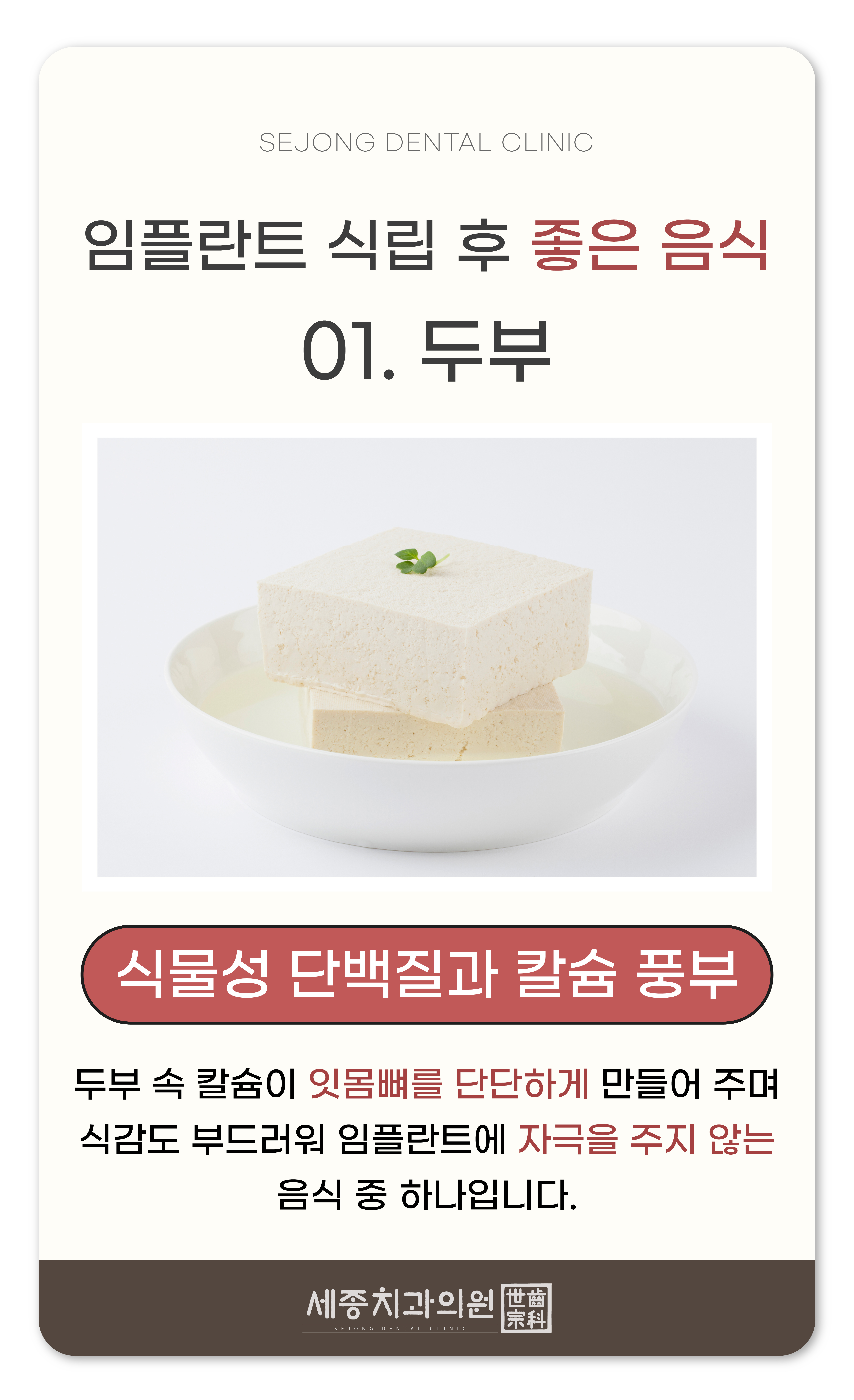 1. 두부 / 면역력에 좋은 비타민A 두부류는 콩의 식물성 단백질이 풍부하고 두부 속 칼슘이 잇몸뼈를 단단하게 만들어 줍니다. 그리고 식감이 부드러워 임플란트 수술 부위에 자극을 주지 않습니다.