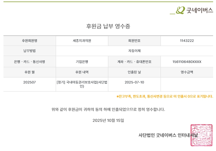 2025년 7월 폐금 보고서와 굿네이버스 후원금 납부 영수증입니다.