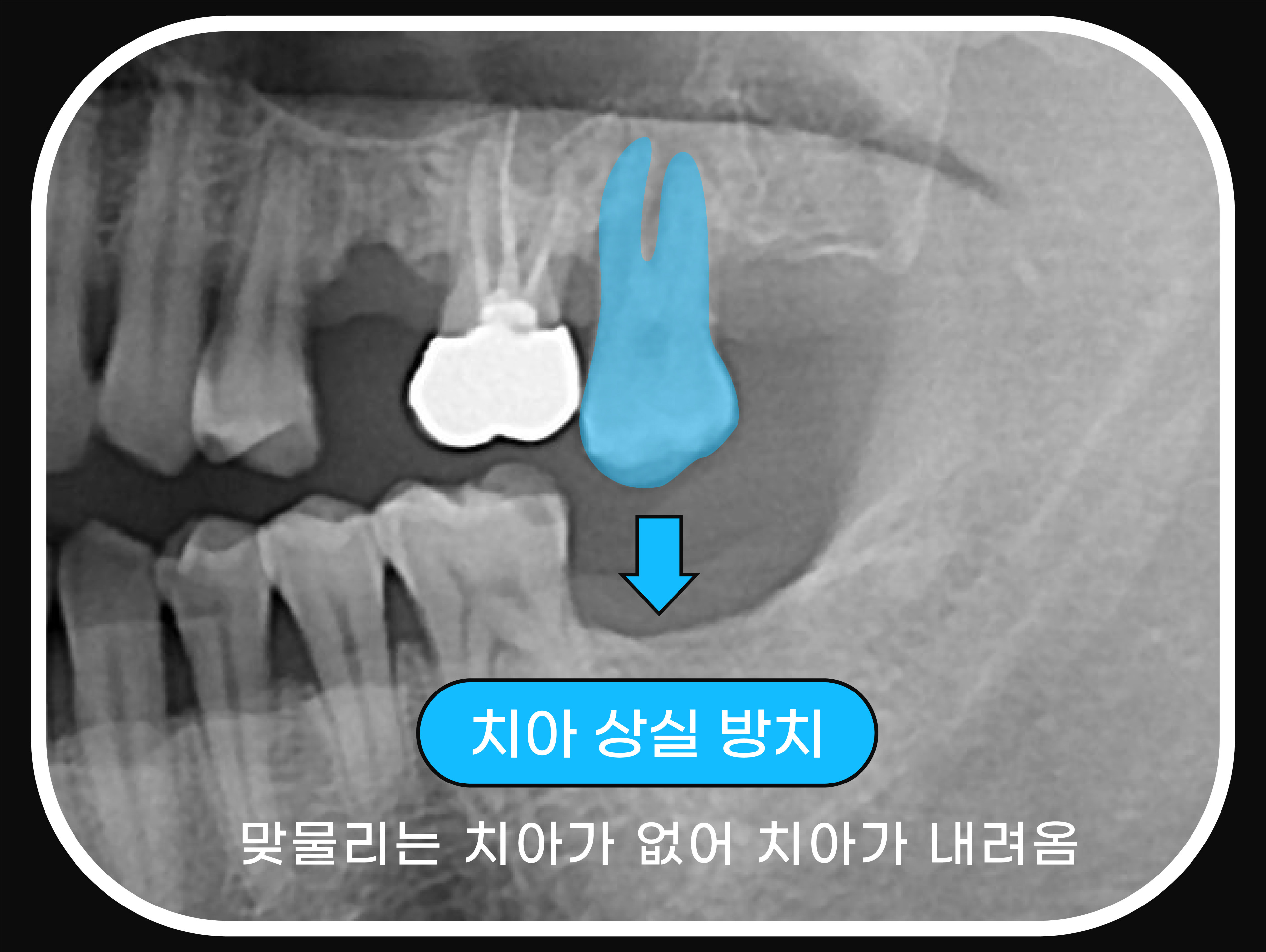 해운대임플란트치과 세종치과 50대 남성 환자의 부러진 치아의 파노라마를 살펴보니 과거에 신경 치료를 한 치아였는데요. 아무래도 하악 어금니가 없어 신경치료를 한 치아로 저작기능을 하다 보니 강한 힘을 버티지 못하고 파절이 된 것 같았습니다.