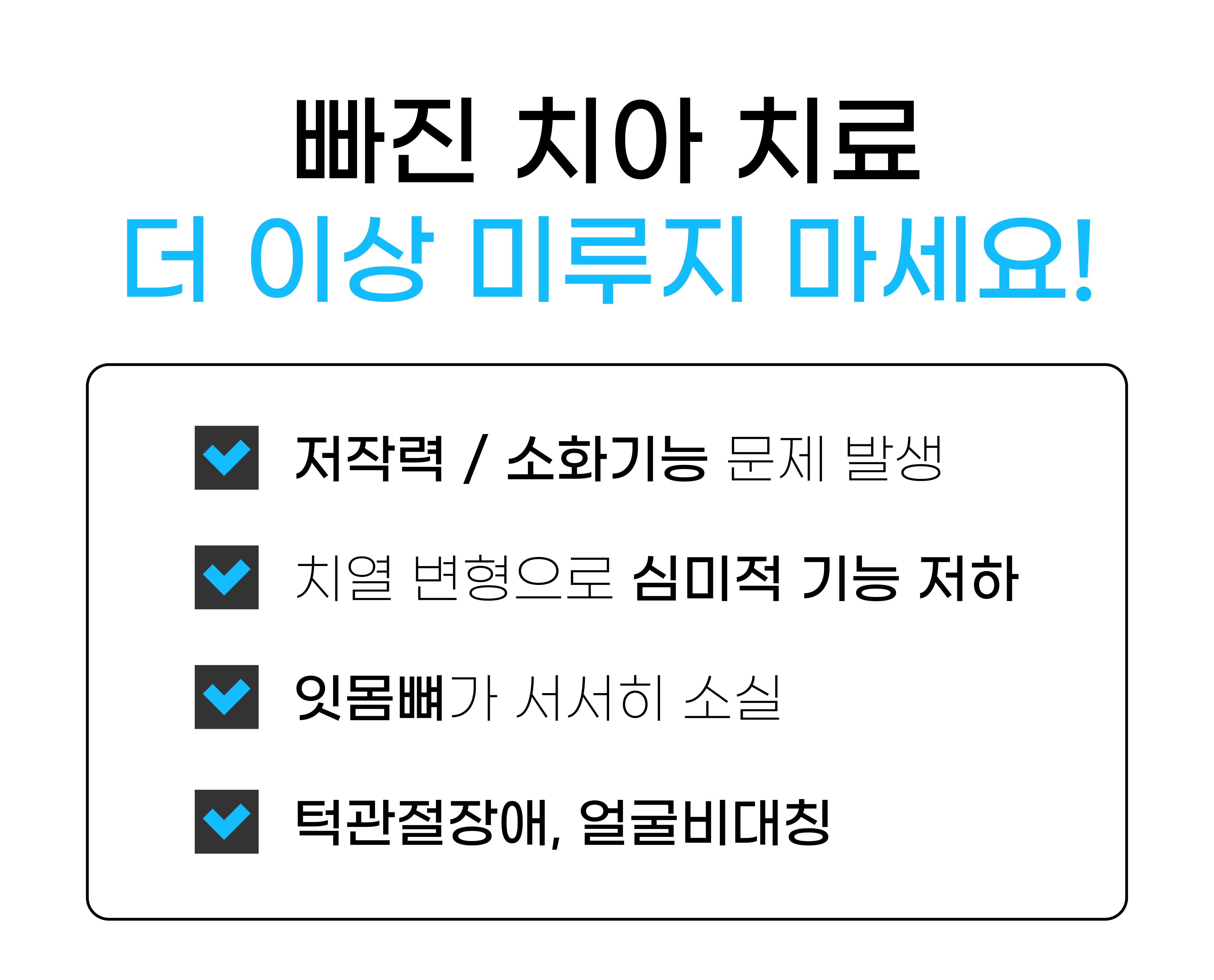 해운대임플란트치과 세종치과 50대 남성 환자분처럼 빠진 치아의 치료를 미루지 마세요! 치아의 크기는 작지만 작은 치아 하나만 없어도 여러 가지 어려움을 겪을 수 있습니다. 치아 하나만 없을 뿐인데도 소화불량이나 발음이 부정확해지고 잇몸뼈가 소실 등 다양한 문제점이 발생할 수 있습니다.