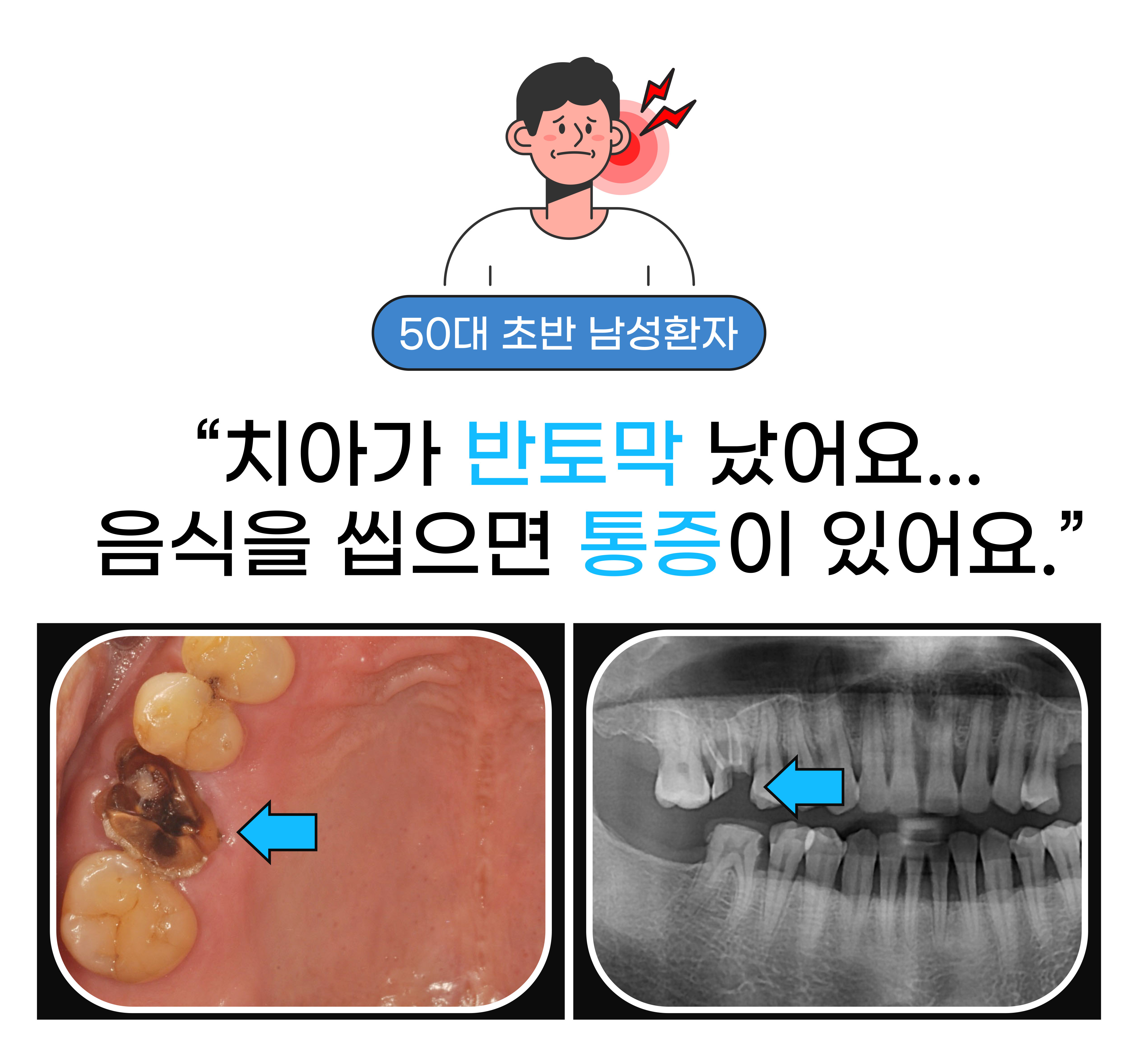 안녕하세요, 해운대임플란트치과 세종치과입니다. 오늘 소개해 드릴 해운대임플란트치과 세종치과 10주년 환자분은 첫 내원 시 치아가 반 토막이 났으며 음식을 씹으면 통증이 있다고 하셨는데요. 이렇게 통증이 느껴지고 치아 뿌리만 남아 있는 경우에는 일반 치과 진료가 아닌 임플란트를 권하는 이유를 오늘 50대 남성 환자분의 사례를 통해 알려드리겠습니다.
