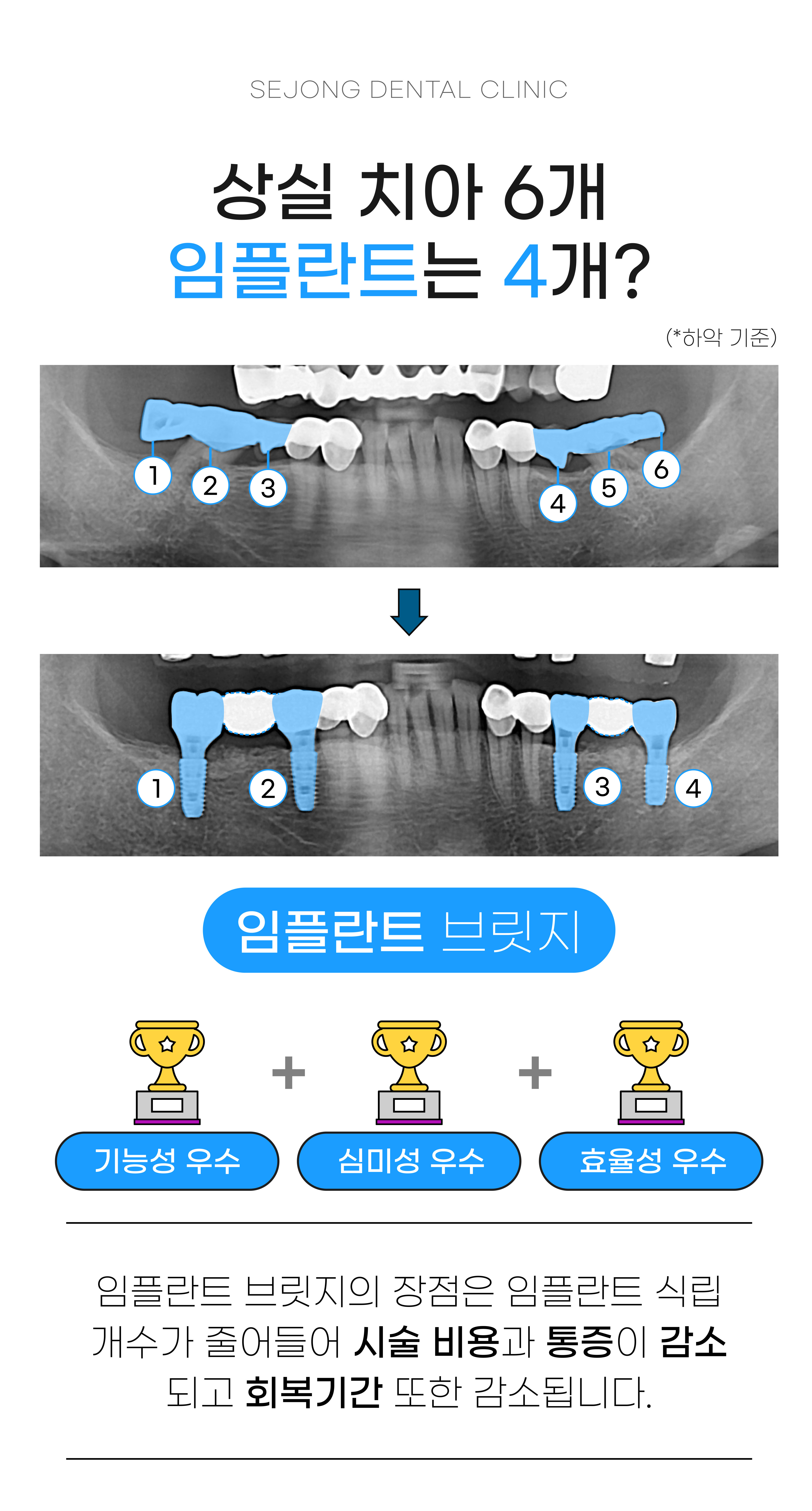 브릿지의 단점을 '임플란트 브릿지'가 보완해 줄 수 있는데요. 임플란트 브릿지는 임플란트와 브릿지를 연결하여 임플란트 식립 개수를 줄이고 다수의 치아를 회복하는 치료입니다. 위의 파노라마 사진에서 볼 수 있듯이, 하악 기준 상실한 치아의 개수는 6개이지만 임플란트는 4개만 식립하여 1. 시술 비용 감소 2. 통증 감소 3. 회복 기간 감소 등의 장점을 얻을 수 있습니다.