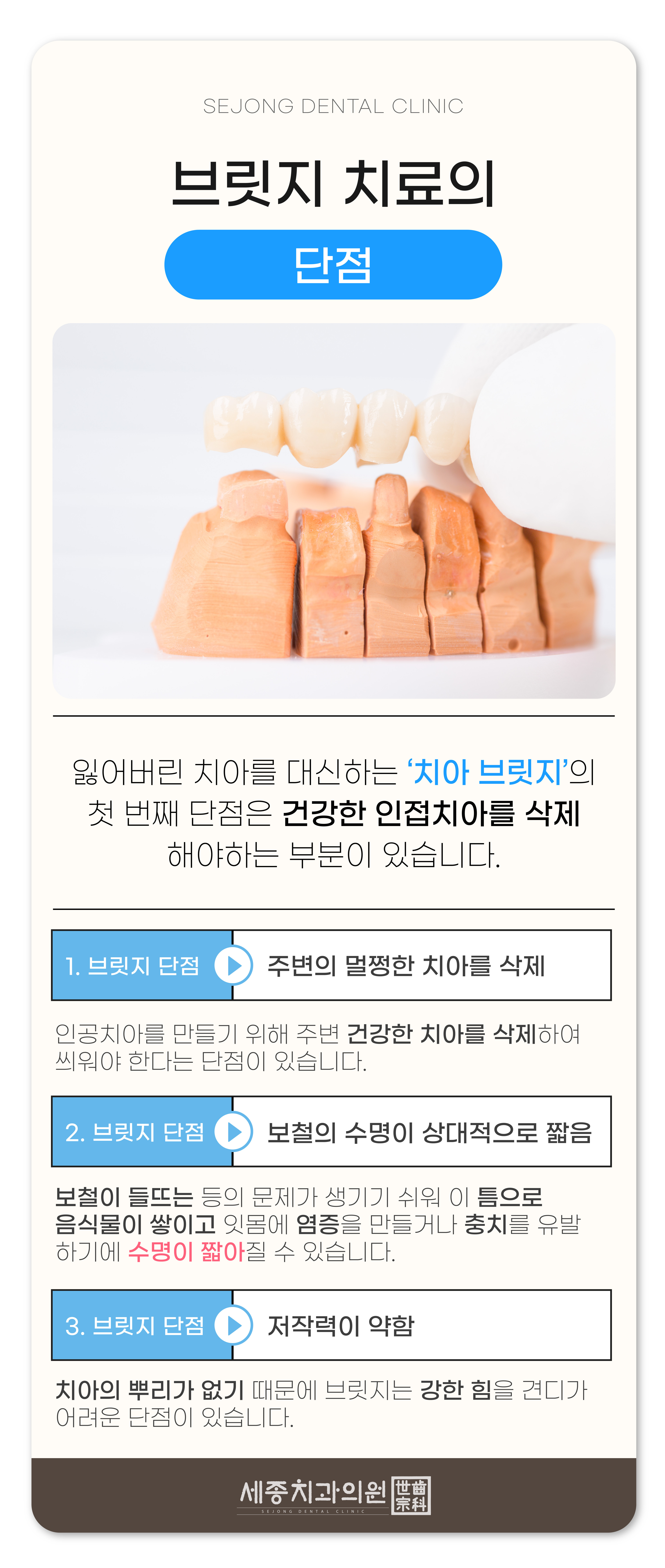 주변의 건강한 치아를 삭제하여 씌워야 한다는 단점이 있으며, 보철의 수명이 임플란트 보다 짧습니다. 브릿지는 일반적으로 8년 정도의 수명을 가지고 있지만, 관리가 잘되지 않을 경우 평균 수명 전에 재치료를 해야 할 수 있습니다.